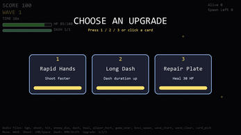 Shoot faster, hit harder, improve your dash, or shape your run with survival-focused upgrades.