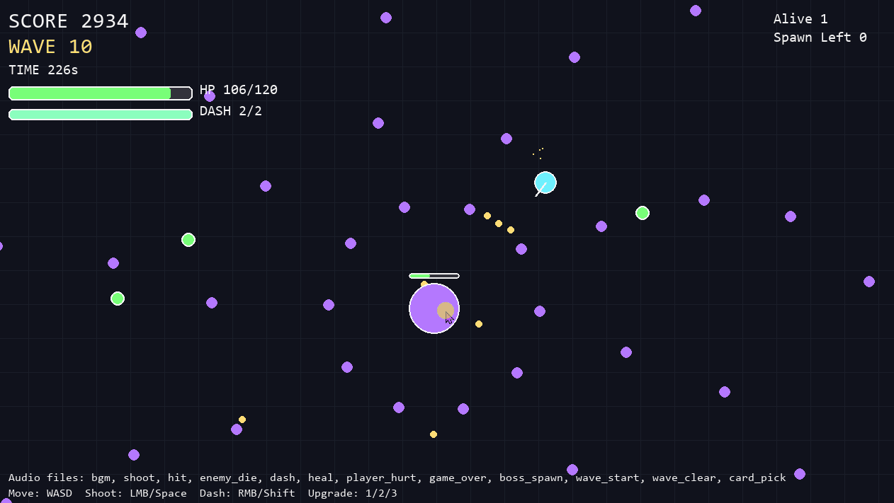| Tags | Arena Shooter, Bullet Hell, pygame, Roguelite, Singleplayer, upgrades, wave-based |